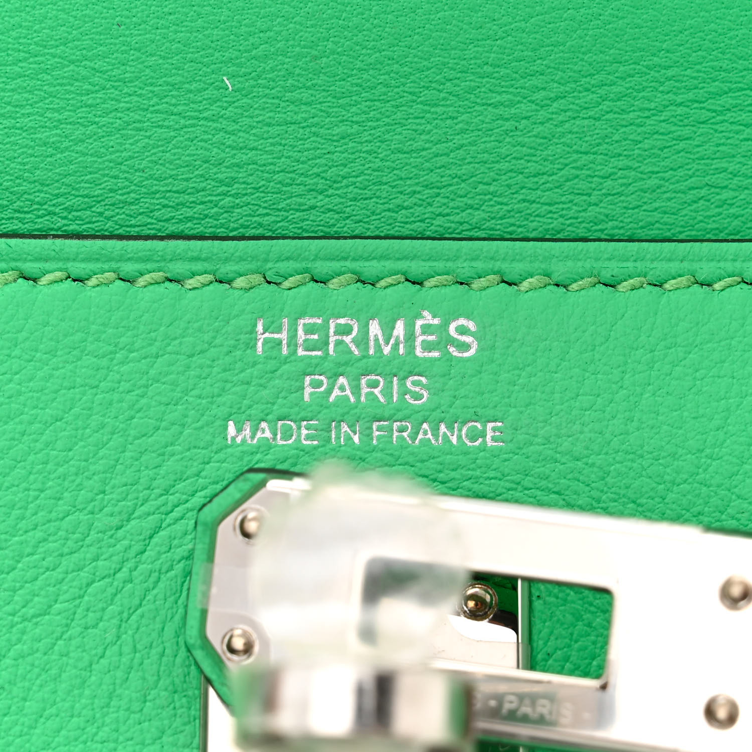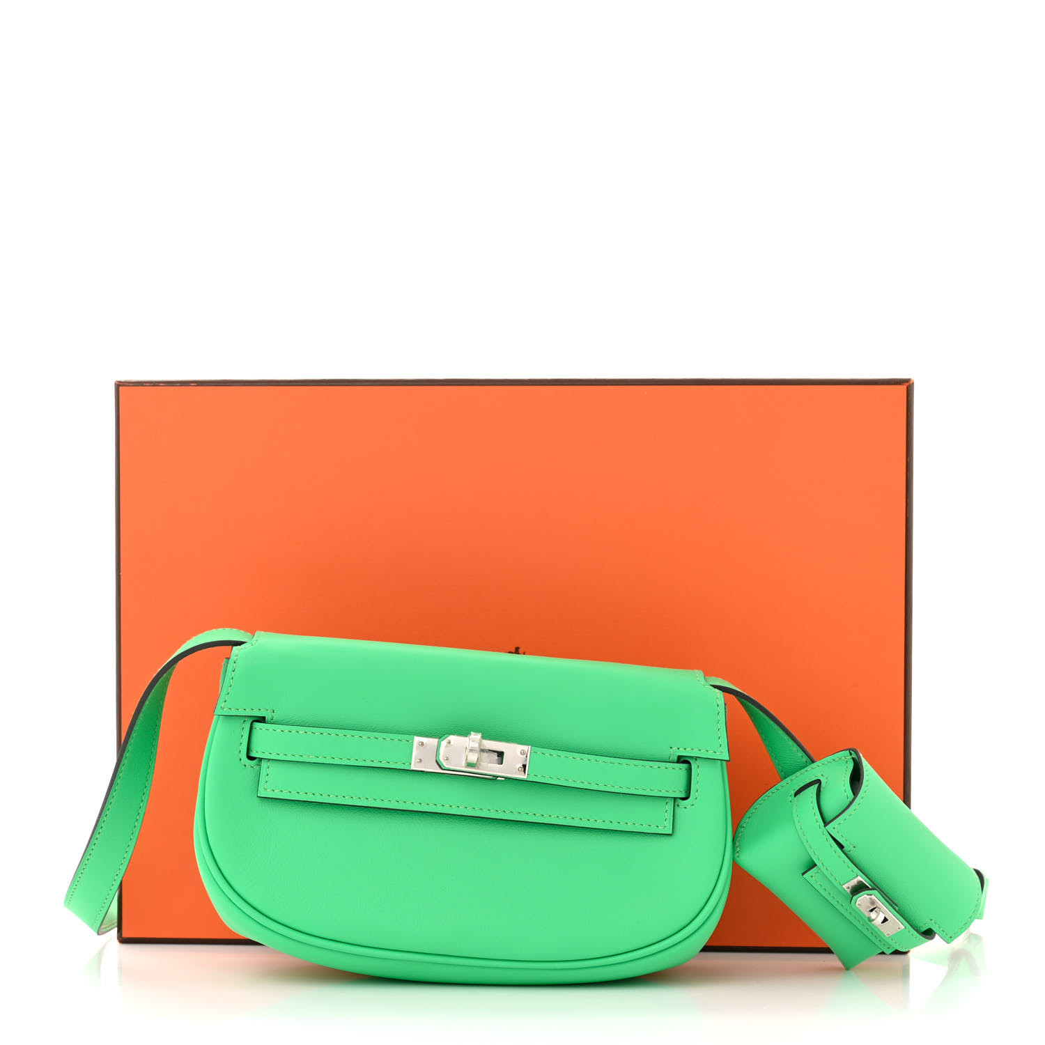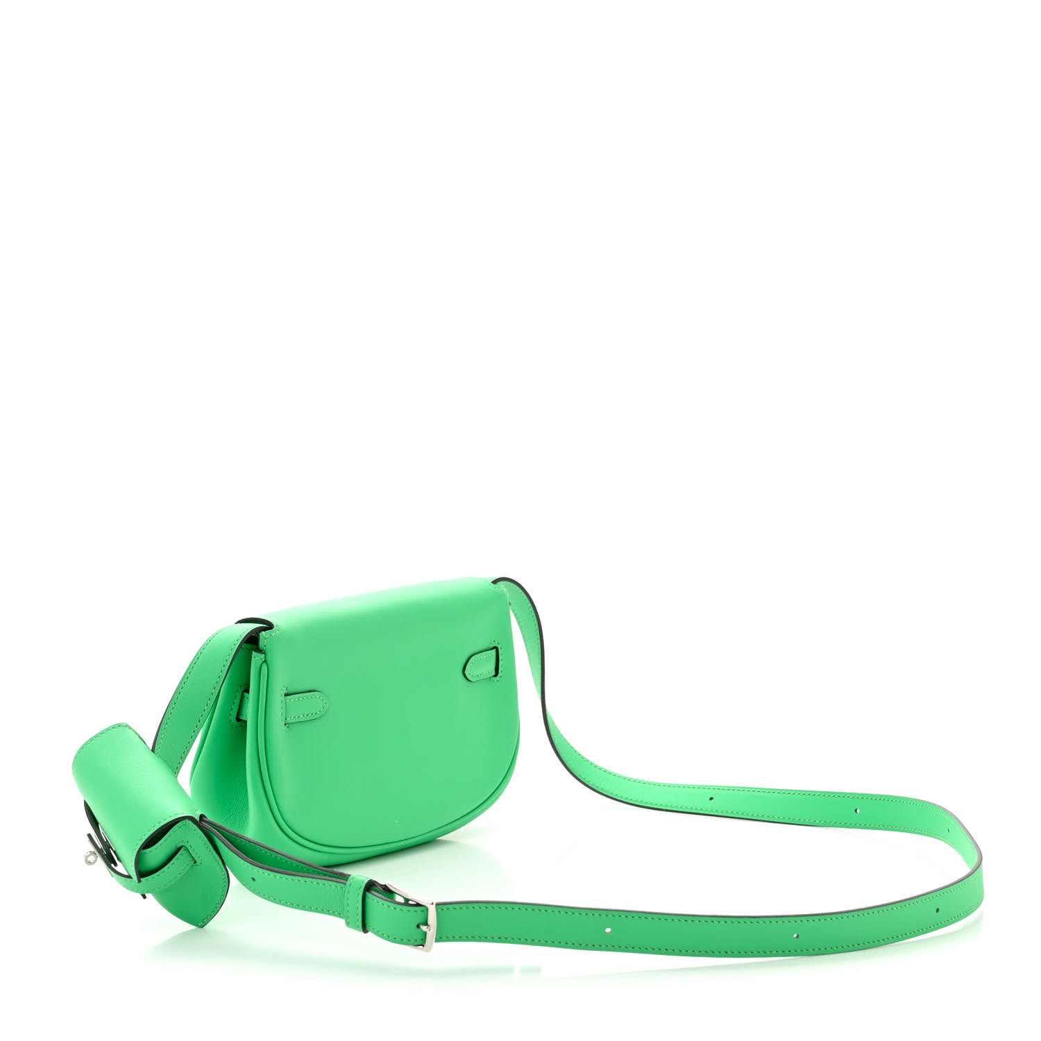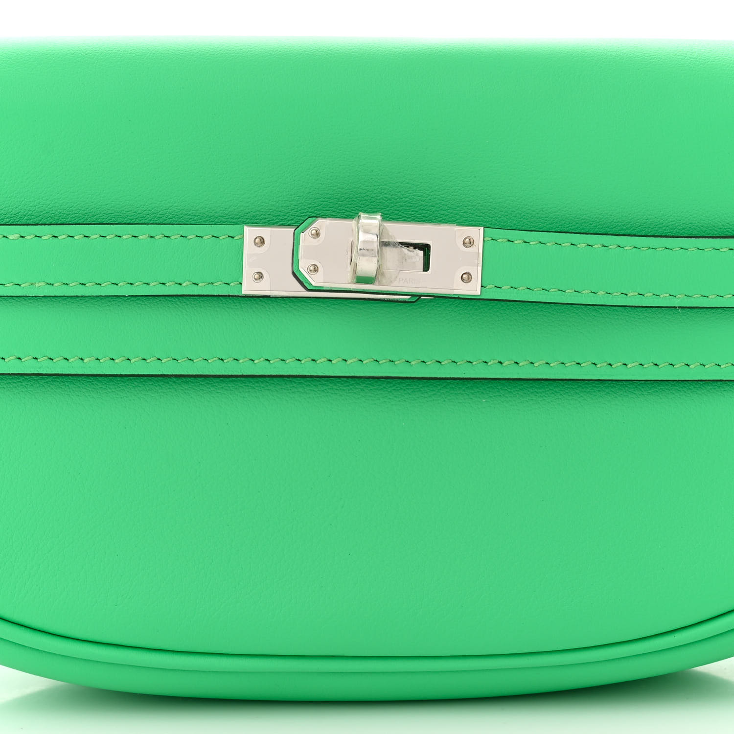 This is an authentic HERMES Swift Kelly Moovein Vert Comic. This stylish shoulder bag is crafted of swift leather in green. The bag features a lengthy crossbody strap with a coin purse attached and polished palladium silver hardware. The silver turn lock opens to a matching interior with a pocket.