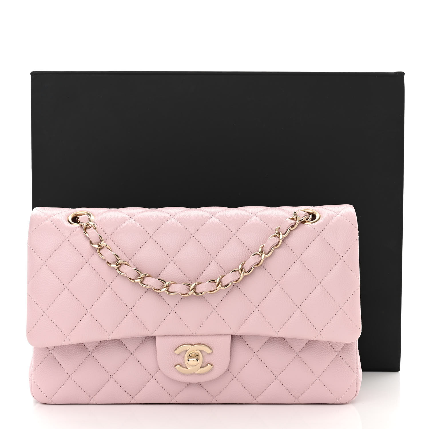 This is a Chanel lambskin quilted medium light pink double flap handbag. This classic medium flap bag is beautifully crafted in luxurious pink leather. The bag has a gold-tone chain shoulder strap that is threaded with pink leather and a cross over flap with a gold-tone Chanel CC turn lock on the front. The handbag opens with an inside flap and a matching pink matte leather inside pocket.