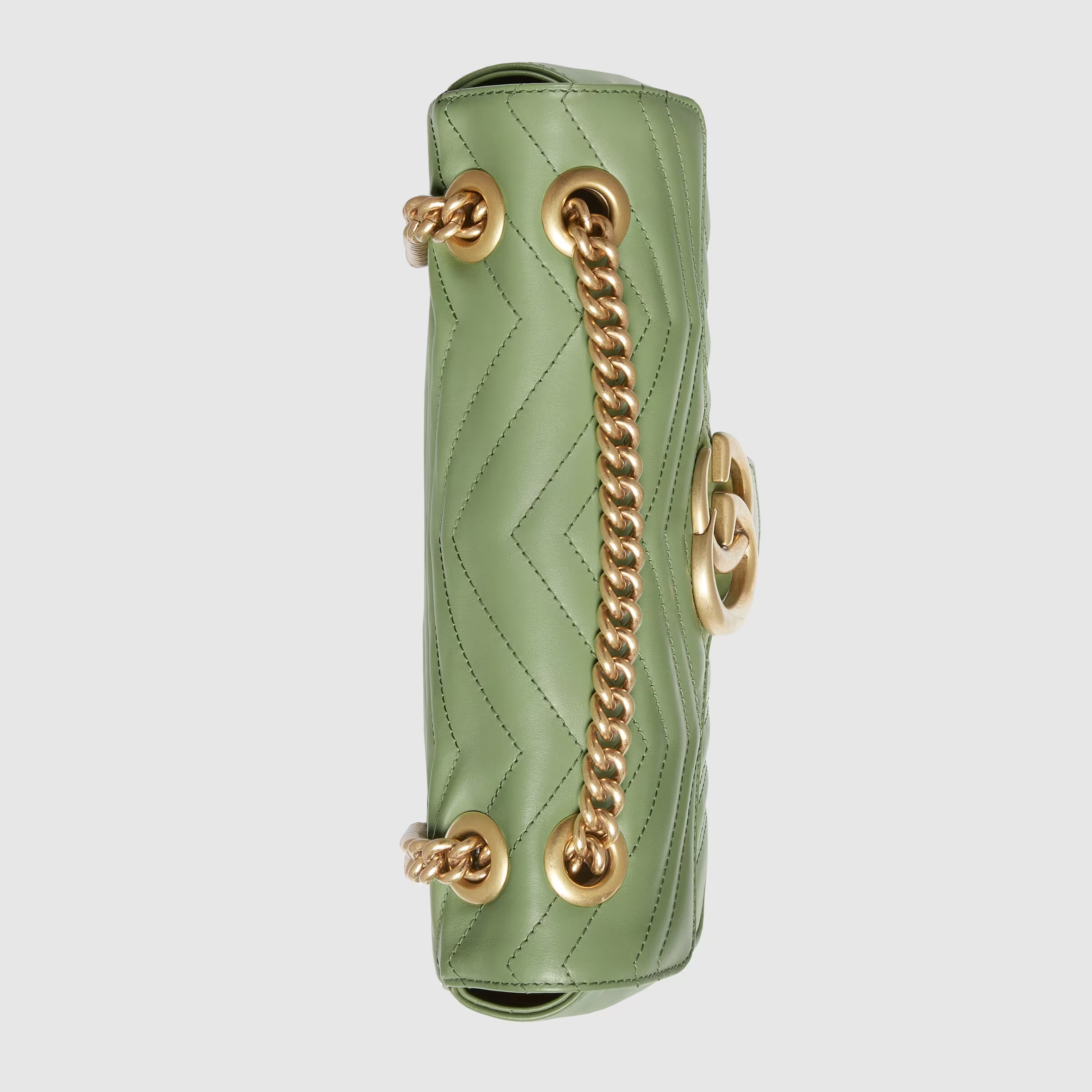 The softly structured shape of the small GG Marmont chain shoulder bag is defined by the antique gold-toned Double G hardware. The sliding chain strap can be worn multiple ways, changing between a shoulder and a top handle bag. Crafted in matelassé leather, it's enriched with curved patterns that play with fresh geometries.