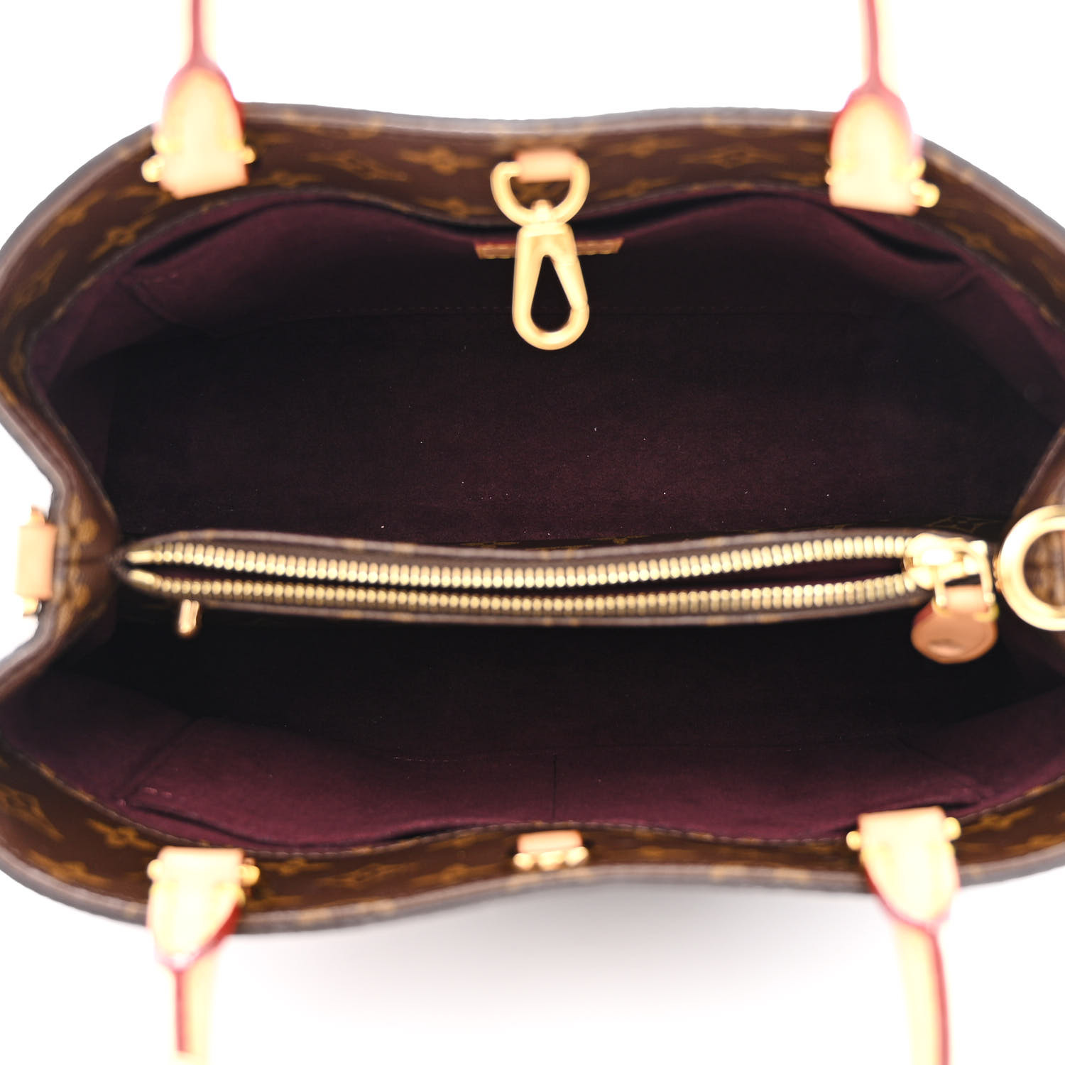 This chic tote is crafted of Louis Vuitton monogram toile canvas. The bag features rolled vachetta leather top handles, an optional toile canvas shoulder strap, and gold hardware. The top is open to a partitioned plum purple microfiber interior with patch pockets and central zipper compartment.