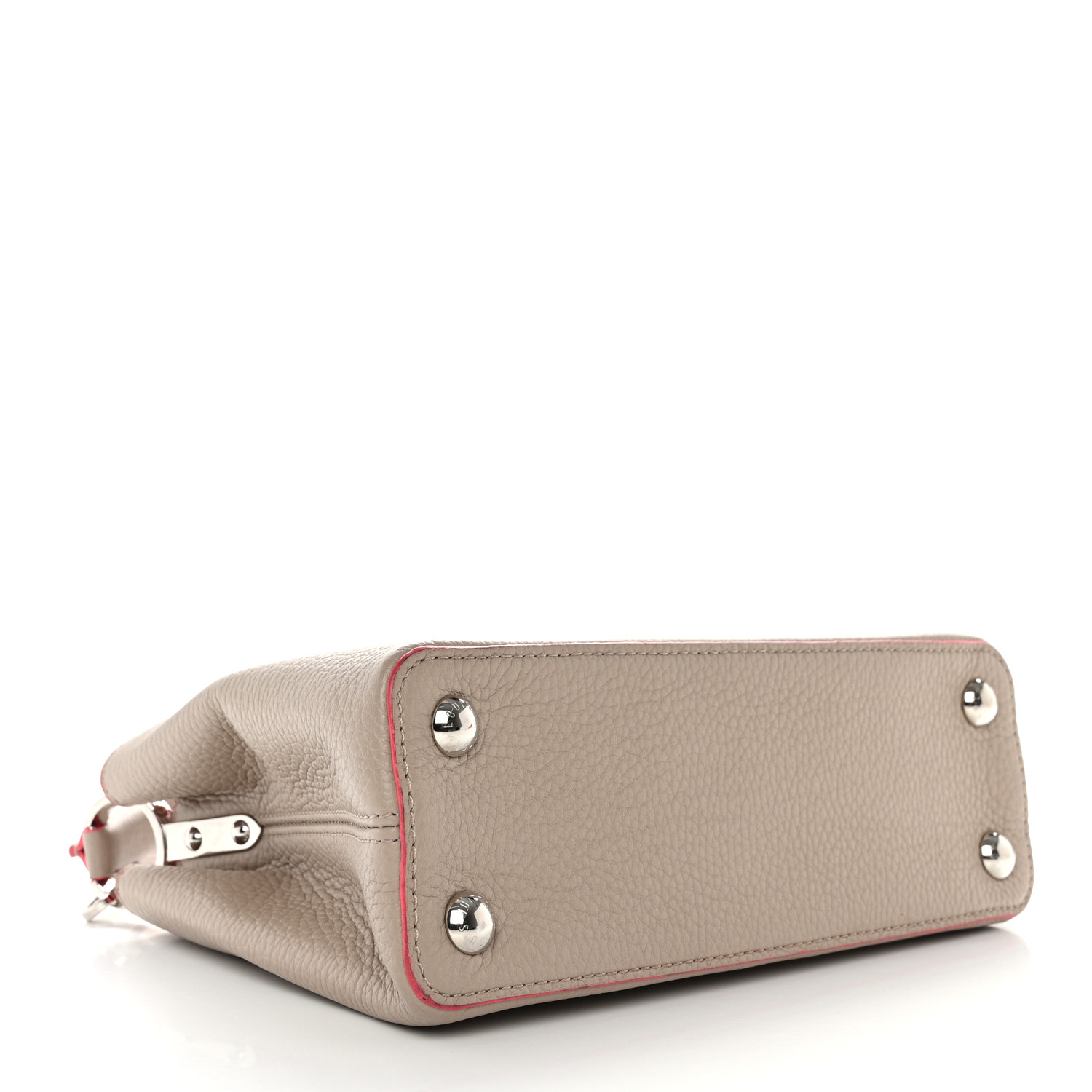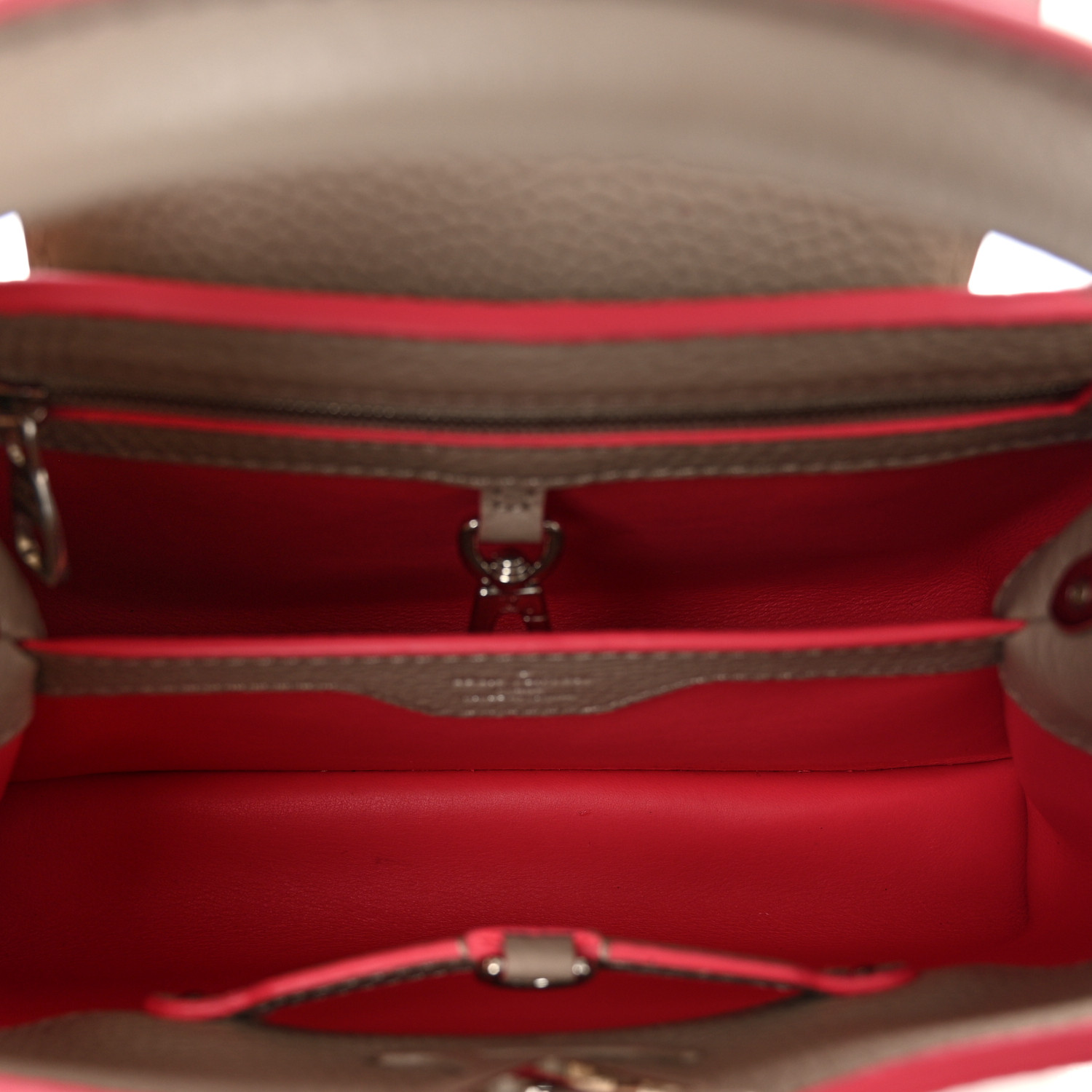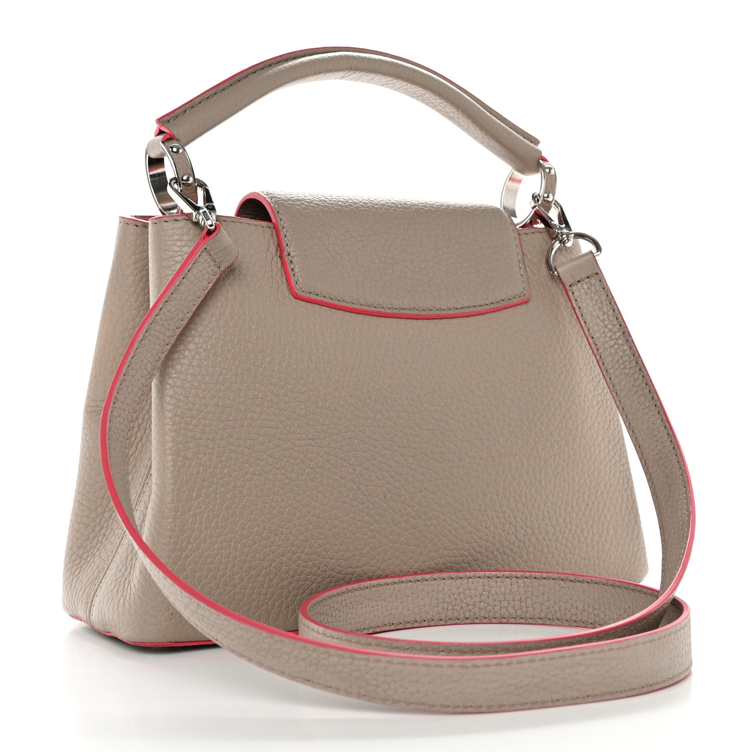 This authentic LOUIS VUITTON Taurillon Capucines BB in Galet and Litchi. This beautiful bag is crafted of beige textured leather in stone beige with pink trim. This handbag features an optional shoulder strap, a flap closure, and silver hardware. The top opens to a matching matte leather interior with a zipper pocket.