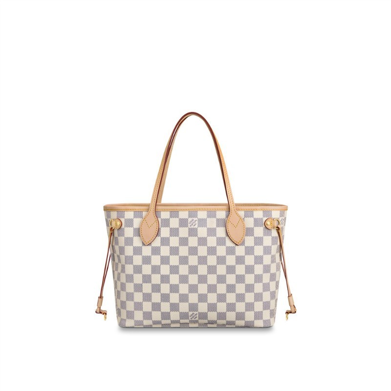 The Neverfull PM tote pairs timeless design with heritage details. Crafted from Damier Azur canvas with natural cowhide trim, it is capacious yet not bulky, with side laces that cinch for a sleek allure or loosen for a casual look. Slim, comfortable handles slip easily over the shoulder or arm. Lined in colorful textile, it features a removable pouch which can be used as a clutch or an extra pocket.